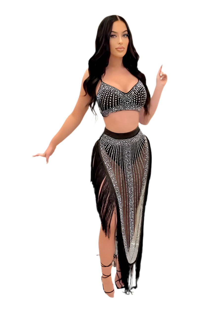 بدلة رقص مكونة من قطعتين چيبة شيفون وتوب مصمم بعناية مع لمسة من الاسترس لتضفى لمعة ولمسة من الجمال على الإطلالة