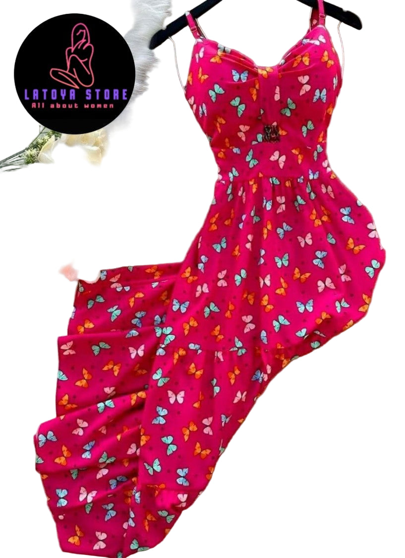 كاش طويل بحمالات رفيعة مصنوع من خامة ناعمة ومزين بنقشة الفراشات الرقيقة التي تضيف لمسة من الحيوية والجاذبية
