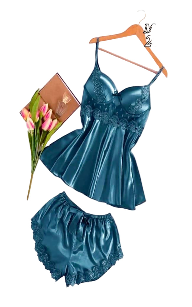 بيچامة من الستان الناعم مكونة من شورت وتوب، خامة مريحة ولامعة تمنحك إحساس بالتميز